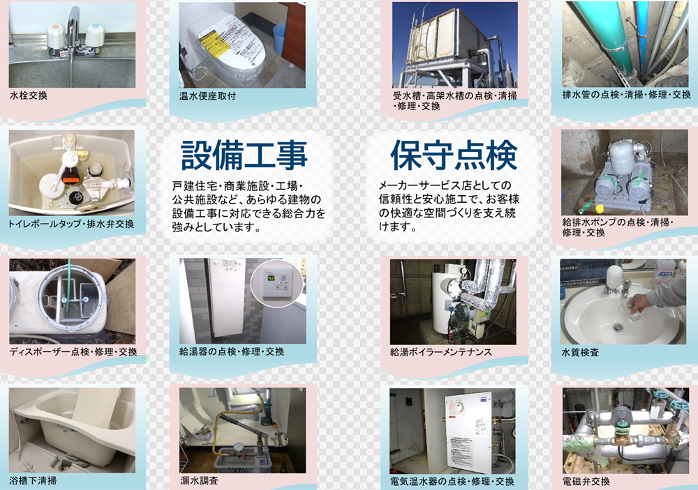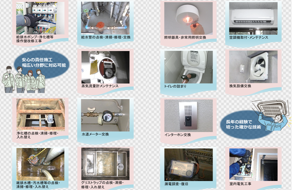 ビルのメンテナンスからちょっとした修理。雨漏りや設備配管の修理などの様々なご要望に対応します。